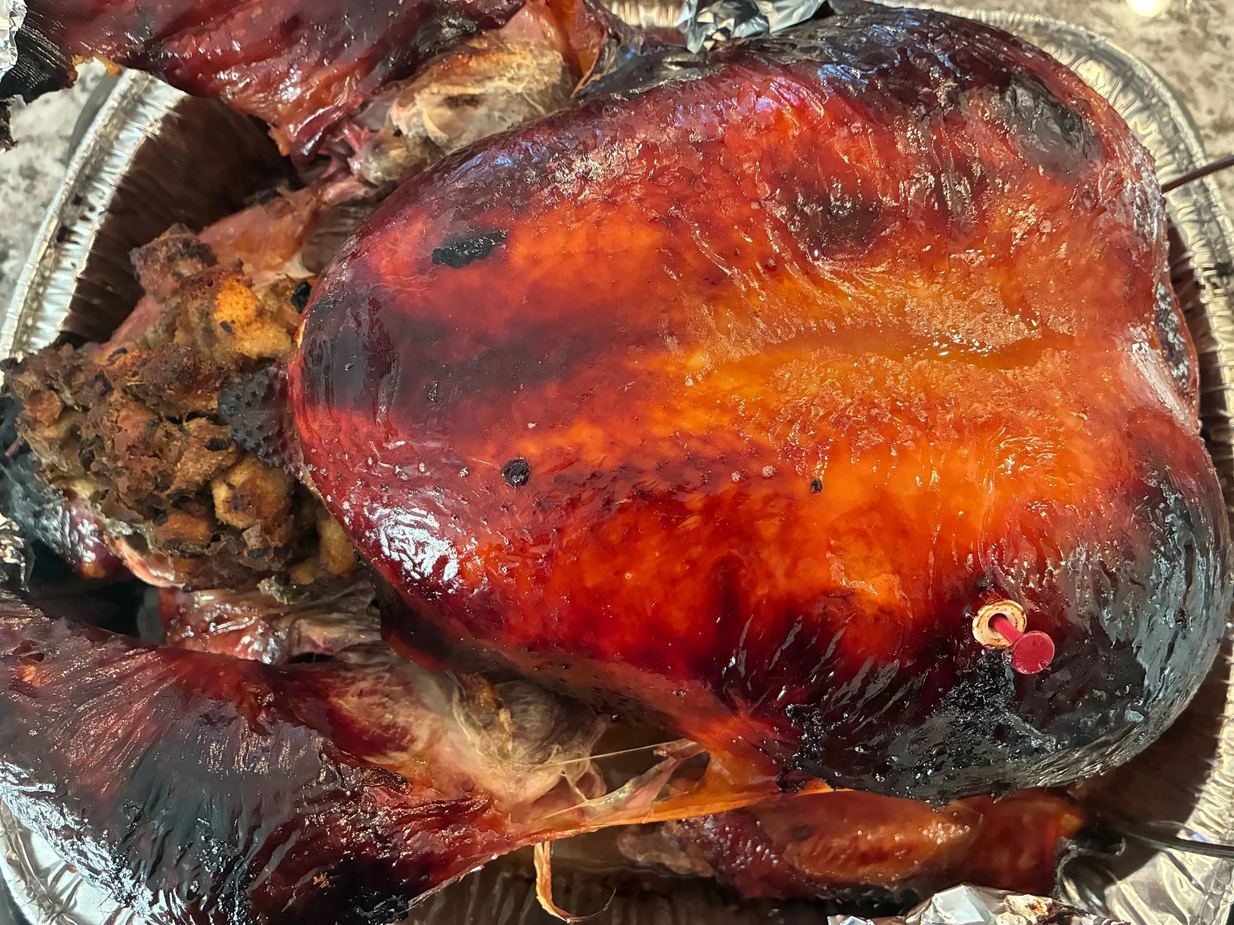 Bird was stuffed and coated in a whole stick of butter by our hero Jen. Don’t forget to put the carrots, celery, white wine and chicken broth in the pan. Always make sure we have enough foil. Raise the rack one more level next time. As per usual, the popper was considered suspect until it dutifully popped at 4:20.